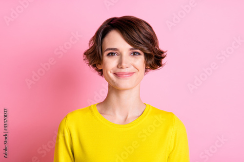 Portrait of attractive confident cheerful brown-haired girl isolated over pink pastel color background