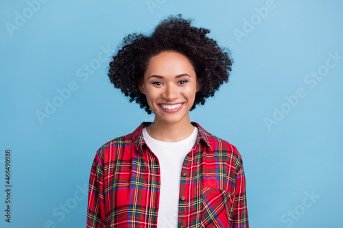 Portrait of attractive content cheerful girl smiling wearing checked shirt isolated over blue color background