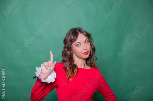 portrait of Attractive happy girl pointing at something. Emotional expressing woman in red dress, red lips and dark curly hairstyle.how product, brand. Gorgeous woman love product. It use for