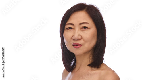 Portrait of attractive Korean mature woman, in her 60s with dark hair and well-kept, healthy skin isolated on white background. Concept of skin care, anti-aging products, cosmetology