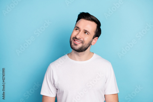 Portrait of attractive minded cheerful guy wearing white tshirt deciding copy space isolated over blue bright pastel color background