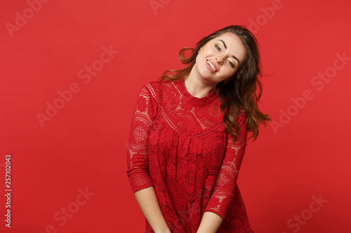 Portrait of attractive sexy young woman in lace dress standing and looking camera isolated on bright red wall background in studio. People sincere emotions, lifestyle concept. Mock up copy space.