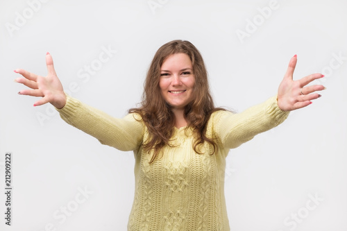 portrait of attractive smiling caucasian woman raised up arms hands at you. She is dressed in yellow sweater. Happy to welcome a friend or guest. I want to hug you.