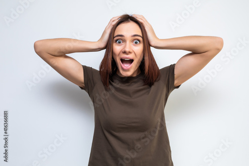 portrait of attractive surprised excited scared screaming teenage, hold hands on head, open mouth with brown long hair, isolated over white background