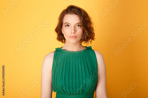 portrait of attractive woman looking at camera isolated on orange