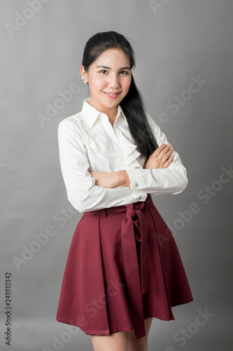 Portrait of beautiful business woman on grey background, studio shot