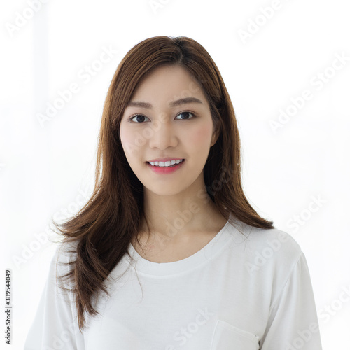 Portrait of beautiful and cute long hair Asian woman standing and looking to camera with a wild and warm smile on her face