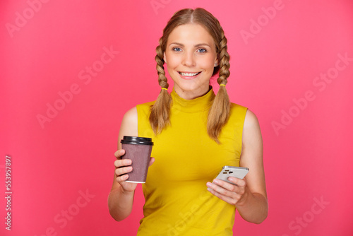 Portrait of beautiful and smiling young woman with pigtails over isolated pink background holding takeaway coffee cup and mobile phone.