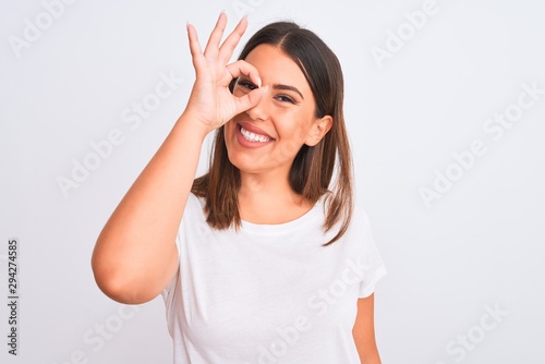 Portrait of beautiful and young brunette woman standing over isolated white background doing ok gesture with hand smiling, eye looking through fingers with happy face.
