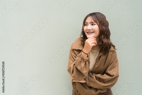 Portrait of Beautiful And Young Cute Asian Woman Against Outdoors Studio Background