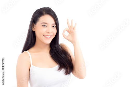 Portrait of beautiful asian woman makeup of cosmetic, beauty of girl with face smile and gesture ok attractive isolated on white background, perfect with wellness and healthcare concept.