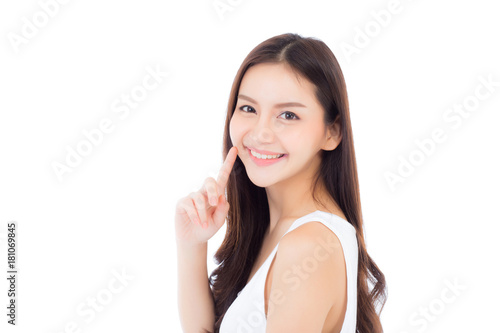 Portrait of beautiful asian woman makeup of cosmetic, girl hand touch cheek and smile attractive, face of beauty perfect with wellness isolated on white background with skin healthcare concept.