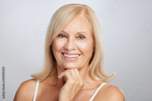 Portrait of beautiful blond senior woman posing and looking at the camera. Beauty photography