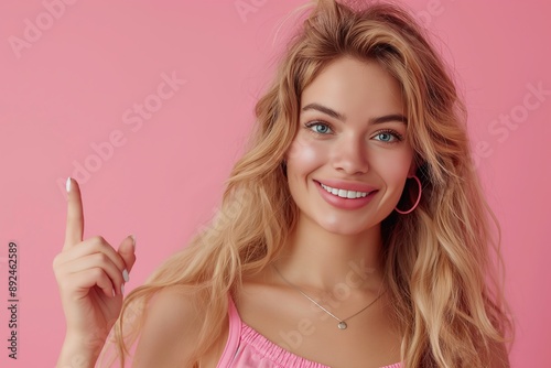Portrait of beautiful blonde woman with long hair, wearing pink casual and smiling