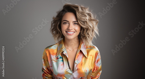 Portrait of beautiful female model with moisturized, clean natural skin, white smile, laughing and smiling, applying face care lotion, cream