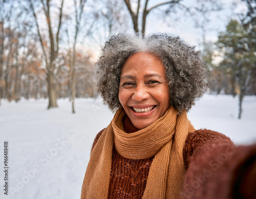 Portrait of Beautiful Happy Black Woman Outdoors in Park During Winter Taking Selfie