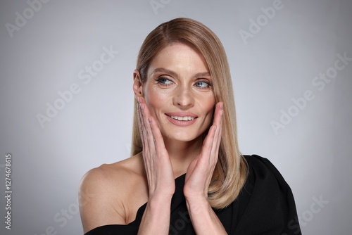 Portrait of beautiful happy woman with straight blonde hair on grey background