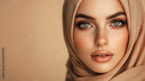 Portrait of beautiful modern muslim woman with natural make-up dressed in hijab posing on soft color background in studio. Facial skin care, female beauty