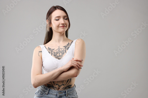 Portrait of beautiful tattooed woman on grey background. Space for text