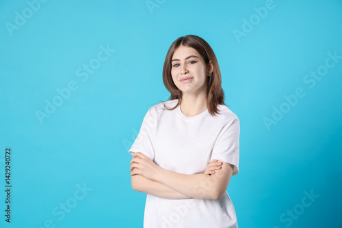 Portrait of beautiful teenage girl with crossed arms on light blue background. Space for text