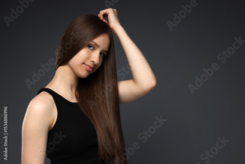 Portrait of beautiful teenage girl with healthy long hair on dark grey background. Space for text