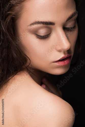 portrait of beautiful tender girl with brunette hair and perfect skin