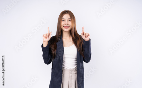 Portrait of beautiful woman in suit pointing her fingers upwards with both hands smiling in studio on white background