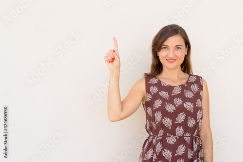 Portrait of beautiful woman pointing finger to copy space outdoors againt plain wall