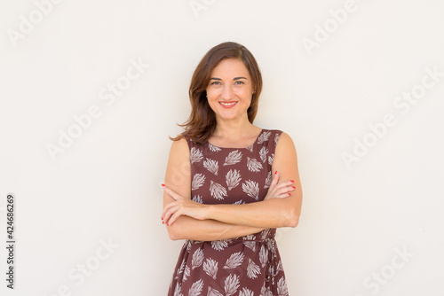 Portrait of beautiful woman smiling outdoors againt plain wall with arms crossed
