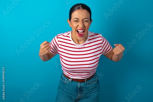 Portrait of beautiful woman wearing striped T-shirt over blue studio background looks with excitement at camera, keeps hands raised over head, notices something unexpected reacts on sudden news.