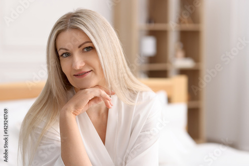Portrait of beautiful woman with blonde hair indoors. Space for text