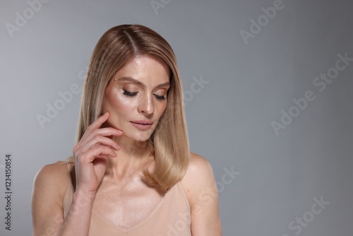 Portrait of beautiful woman with straight blonde hair and stylish makeup on light grey background, space for text
