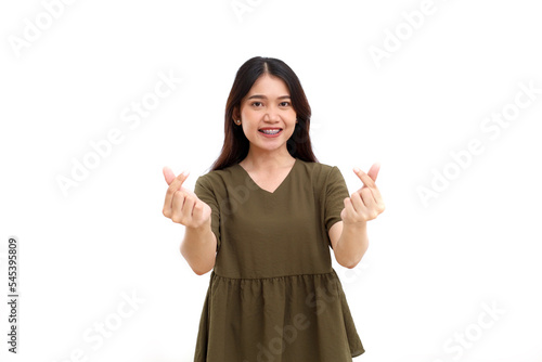 Portrait of beautiful young asian woman standing while showing love shape hand gesture. Isolated on white
