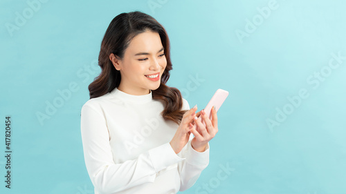 Portrait of Beautiful Young Asian woman using mobile phone isolated on blue background.