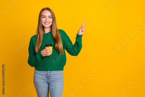 Portrait of beautiful young blonde hair model with cup with energy dose espresso direct finger mockup isolated on yellow color background
