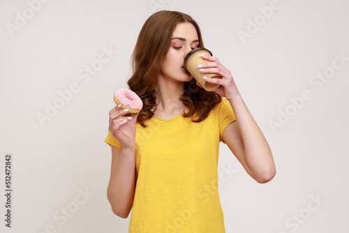 Portrait of beautiful young brown haired teenager girl in casual yellow T-shirt drinking coffee from disposable cup with delicious donut. Indoor studio shot isolated on gray background.