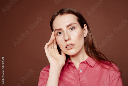 Portrait of beautiful young brown-haired girl in pink blouse touching own face against isolated background