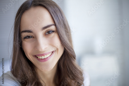 Portrait of Beautiful young brunette woman sitting at the end of the white bed and smiling.
