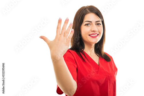 Portrait of beautiful young doctor wearing scrubs showing number five