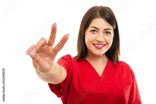 Portrait of beautiful young doctor wearing scrubs showing peace gesture
