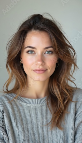 Portrait of beautiful young woman brown hair in grey sweater. Female with natural make-up. Smiling face. Casual style. Beauty, skincare, fashion, elegant, confident look.