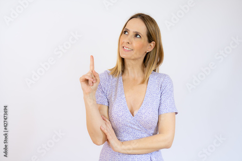 Portrait of beautiful young woman in casual clothes pointing up over white background.