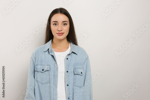 Portrait of beautiful young woman in jeans jacket on white background. Space for text