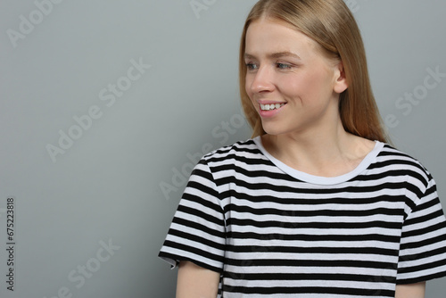 Portrait of beautiful young woman in striped t-shirt on grey background. Space for text