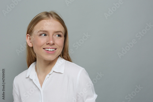 Portrait of beautiful young woman in white shirt on grey background. Space for text