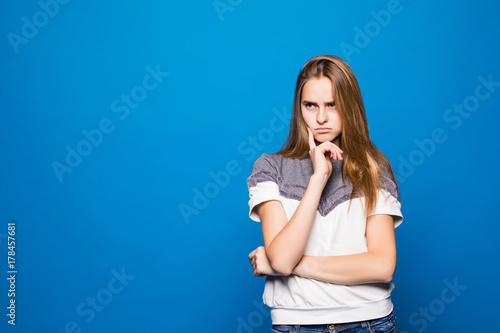 Portrait of beautiful young woman sad with hands on chin against blue background