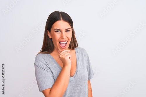 Portrait of beautiful young woman standing over isolated white background looking confident at the camera smiling with crossed arms and hand raised on chin. Thinking positive.