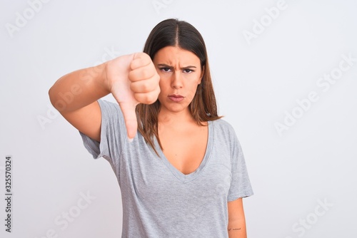 Portrait of beautiful young woman standing over isolated white background looking unhappy and angry showing rejection and negative with thumbs down gesture. Bad expression.