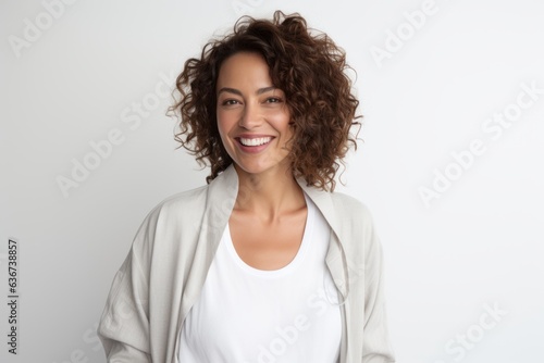 Portrait of beautiful young woman with curly hair smiling and looking at camera