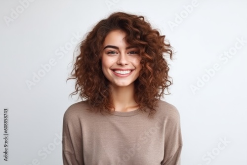 Portrait of beautiful young woman with curly hair smiling at camera over white background